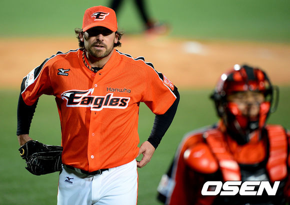 3회초 1사 1,3루에서 한화 이브랜드가 강판당하고 있다.