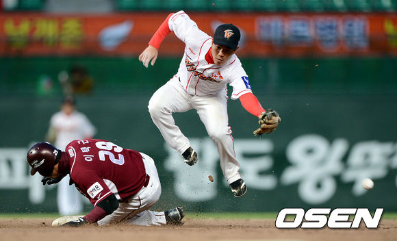 11일 오후 인천 문학구장에서 열린 '2013 한국야쿠르트 세븐 프로야구' SK 와이번스와 넥센 히어로즈의 경기 3회초 1사 1루 SK 정근우가 2루 송구를 잡기위해 점프를 하고 있다.
