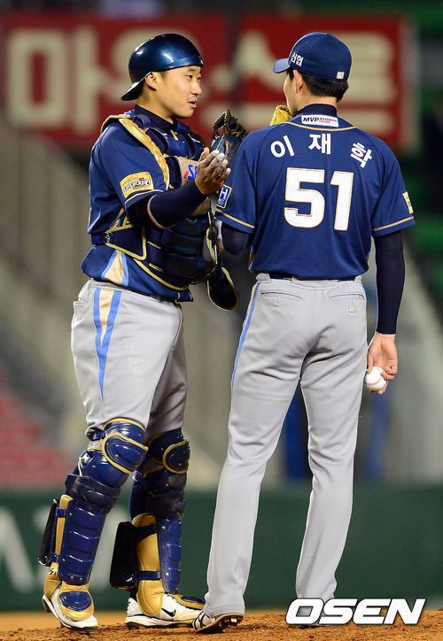 11일 오후 서울 잠실구장에서 열린 '2013 한국야쿠르트 세븐 프로야구' LG 트윈스와 NC 다이노스의 경기 4회말 2사 1,2루 김태군과 이재학이 마운드에서 이야기를 나누고 있다.