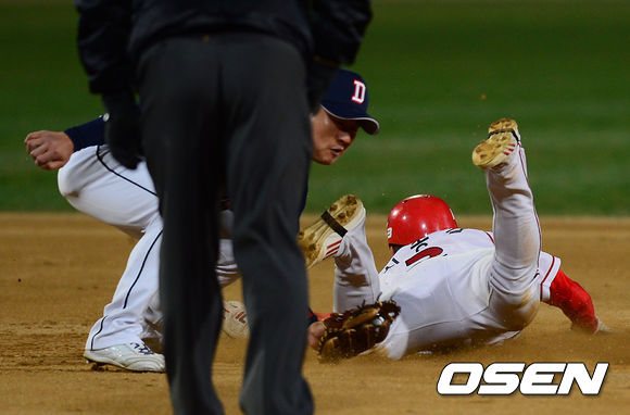 11일 오후 광주 무등경기장에서 '2013 한국야쿠르트 세븐 프로야구' KIA 타이거즈 대 두산 베어스의 경기가 열렸다. 2회말 KIA 공격 2사 1루 상황 신종길이 2루 도루에 성공하고 있다.