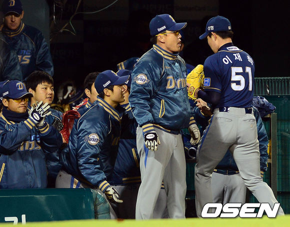 11일 오후 서울 잠실구장에서 열린 '2013 한국야쿠르트 세븐 프로야구' LG 트윈스와 NC 다이노스의 경기 4회말을 마친 이재학이 덕아웃으로 향하며 동료들의 격려를 받고 있다.