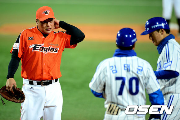 3회말 무사에서 한화 김태균이 삼성 이승엽에 내야안타를 허용하며 아쉬워하고 있다.