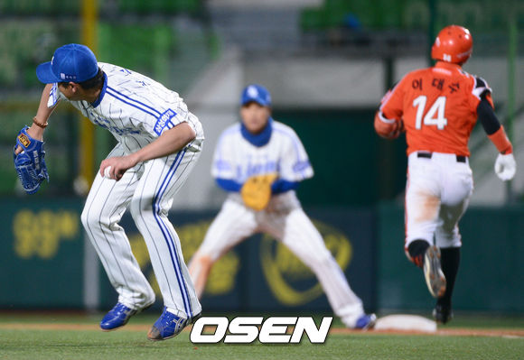 11일 오후 대구구장에서 '2013 한국야쿠르트 세븐 프로야구' 삼성 라이온즈와 한화이글스 경기 4회초 1사 1루 이대수의 투수 강습타구때 삼성 장원삼이 포구를 하며 1루에 송구하였으나 안타를 허용하고 있다.