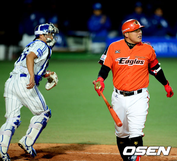 3회초 2사 1루에서 한화 김태균이 삼진을 당하고 아쉬워하고 있다.