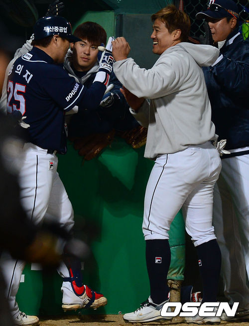 11일 오후 광주 무등경기장에서 '2013 한국야쿠르트 세븐 프로야구' KIA 타이거즈 대 두산 베어스의 경기가 열렸다. 4회초 두산 공격 무사 1루 상황 8번 양의지가 투런포를 날리고 더그아웃 동료들과 인사를 나누고 있다.