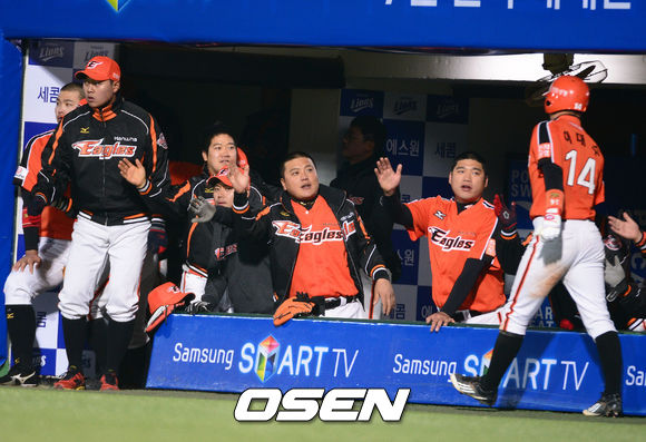 11일 오후 대구구장에서 '2013 한국야쿠르트 세븐 프로야구' 삼성 라이온즈와 한화이글스 경기 4회초 1사 1,3루 한승택의 내야땅볼때 3루 주자 이대수 삼성내야진의 수비실책으로 득점을 올리며 동료들로 부터 환영을 받고 있다.