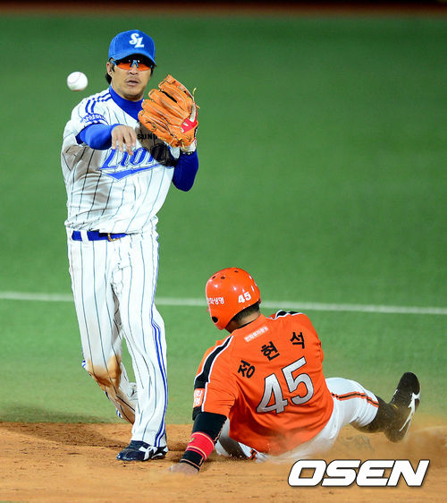 4회초 1사 1,3루에서 삼성 신명철이 한화 한승택의 내야땅볼에 정현석을 포스아웃시키고 1루로 송구하고 있다. 신명철은 악송구로 병살에 실패, 3루주자 이대수는 홈을 밟았다.