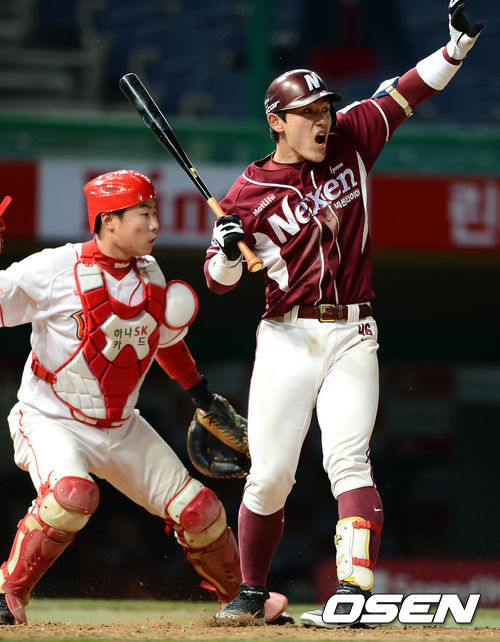 11일 오후 인천 문학구장에서 열린 '2013 한국야쿠르트 세븐 프로야구' SK 와이번스와 넥센 히어로즈의 경기 4회초 무사 1루 넥센 박동원이 투수폭투로 공이 뒤로 빠지자 1루주자 김민성에게 지시를 하고 있다.