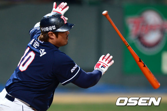11일 오후 광주 무등경기장에서 '2013 한국야쿠르트 세븐 프로야구' KIA 타이거즈 대 두산 베어스의 경기가 열렸다. 4회초 두산 공격 2사 2, 3루 상황 5번 최준석이 2타점 적시타를 날리고 있다.