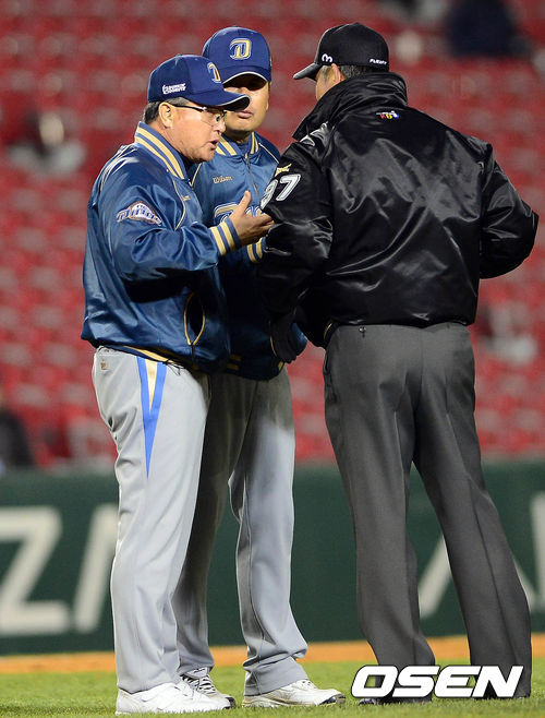 11일 오후 서울 잠실구장에서 열린 '2013 한국야쿠르트 세븐 프로야구' LG 트윈스와 NC 다이노스의 경기 5회말 1사 1루 양영동의 좌전안타 상황, 2루까지 쇄도해 양영동이 2루에서 세이프되자 김경문 감독이 항의하고 있다.