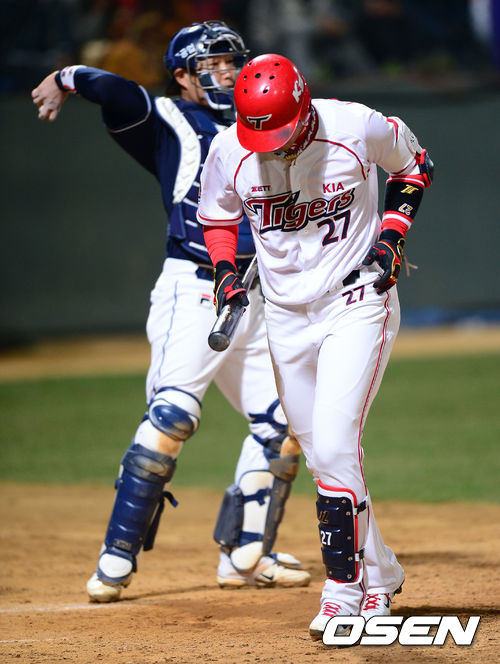 11일 오후 광주 무등경기장에서 '2013 한국야쿠르트 세븐 프로야구' KIA 타이거즈 대 두산 베어스의 경기가 열렸다. 4회말 KIA 공격 2사 주자없는 상황 6번 김상현이 삼진을 당한 뒤 더그아웃으로 들어가고 있다.