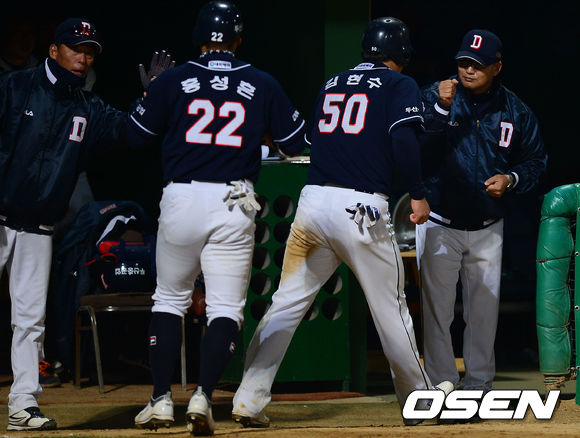11일 오후 광주 무등경기장에서 '2013 한국야쿠르트 세븐 프로야구' KIA 타이거즈 대 두산 베어스의 경기가 열렸다. 4회초 두산 공격 2사 2, 3루 상황 5번 최준석의 2타점 적시타로 득점에 성공한 김현수와 홍성흔이 김진욱 감독과 인사를 나누고 있다.
