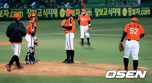 5회말 1사 1,3루에서 한화 김광수가 교체되고 있다. 한화는 선숙단이 삭발을 하고 농군패션을 선보이며 연패 탈출의 의지를 보이고 있으나 5회말 현재 8대3으로 뒤지고 있다.
