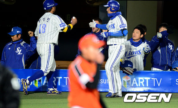 5회말 1사 2,3루에서 삼성 박석민이 이지영의 1타점 적시타에 홈을 밟고 더그아웃에서 동료선수들과 하이파이브를 하고 있다.