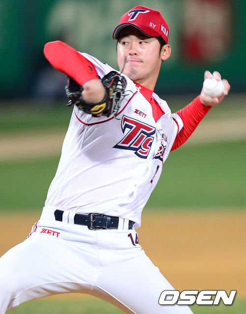 11일 오후 광주 무등경기장에서 '2013 한국야쿠르트 세븐 프로야구' KIA 타이거즈 대 두산 베어스의 경기가 열렸다. 6회초 두산 공격 구원등판한 KIA 투수 진해수가 힘차게 공을 던지고 있다.