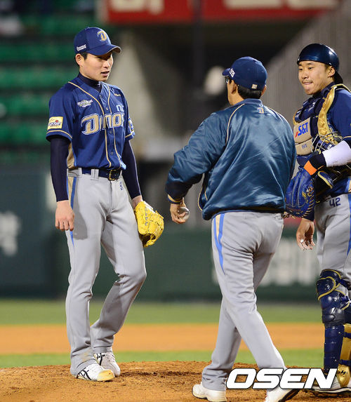 11일 오후 서울 잠실구장에서 열린 '2013 한국야쿠르트 세븐 프로야구' LG 트윈스와 NC 다이노스의 경기 7회말 무사 1루 이재학이 마운드를 내려가고 있다.