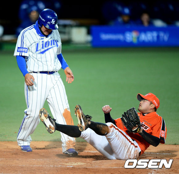 6회말 2사 2,3루에서 한화 안승민의 폭투에 삼성 3루주자 최형우가 홈에서 안승민의 태그에 앞서 세이프되고 있다.