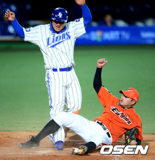 6회말 2사 2,3루에서 한화 안승민의 폭투에 삼성 3루주자 최형우가 홈에서 안승민의 태그에 앞서 세이프되고 있다.