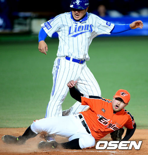 6회말 2사 2,3루에서 한화 안승민의 폭투에 삼성 3루주자 최형우가 홈에서 안승민의 태그에 앞서 세이프되고 있다.