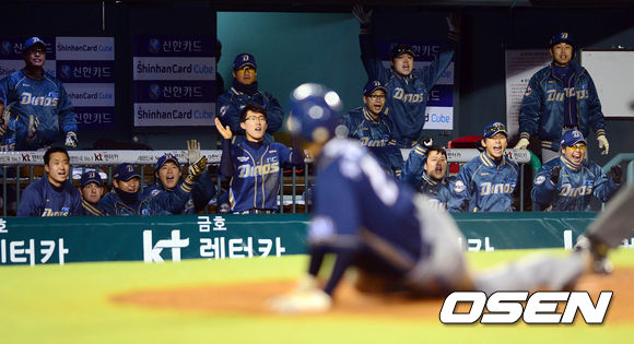 11일 오후 서울 잠실구장에서 열린 '2013 한국야쿠르트 세븐 프로야구' LG 트윈스와 NC 다이노스의 경기 8회초 1사 2,3루 권희동의 1타점 적시타에 차화준이 득점하자 NC 선수들이 환호하고 있다.