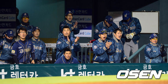 11일 오후 서울 잠실구장에서 열린 '2013 한국야쿠르트 세븐 프로야구' LG 트윈스와 NC 다이노스의 경기 8회초 1사 2,3루 권희동의 1타점 적시타에 차화준이 득점하자 NC 선수들이 환호하고 있다.