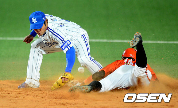 8회초 1사에서 한화 한상훈이 삼성 김태완의 태그에 앞서 2루 도루에 성공하고 있다.