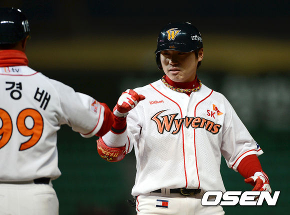 11일 오후 인천 문학구장에서 열린 '2013 한국야쿠르트 세븐 프로야구' SK 와이번스와 넥센 히어로즈의 경기 8회말 2사 1,2루 SK 박재상이 적시타를 때린 뒤 정경배 코치와 기뻐하고 있다.