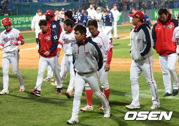 패배한 KIA 선수들이 아쉬운 표정으로 그라운드를 나서고 있다.