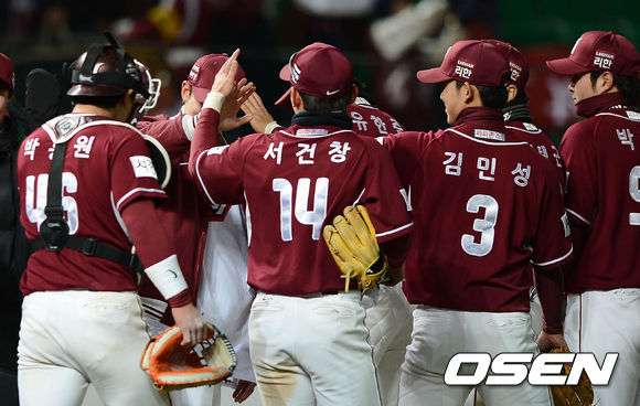승리를 거둔 넥센 선수들이 승리투수 강윤구를 격려하고 있다. / youngrae@osen.co.kr