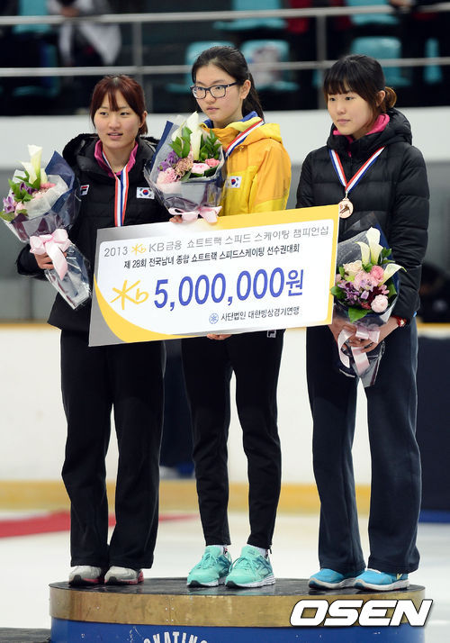 11일 오후 서울 목동아이스링크에서 열린 '2013 KB금융 쇼트트랙 스피트스케이팅 챔피언십' 여자종합 시상식에서 (왼쪽부터)2위 화성시청 박승희, 1위 세화여고 심석희, 3위 전주제일고 김아랑이 포즈를 취하고 있다.