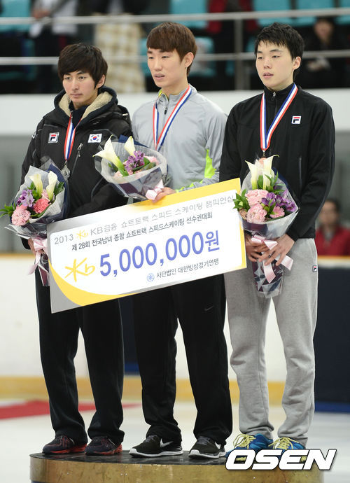 11일 오후 서울 목동아이스링크에서 열린 '2013 KB금융 쇼트트랙 스피트스케이팅 챔피언십' 남자종합 시상식에서 (왼쪽부터)2위 단국대 박세영, 1위 서울시청 이한빈, 3위 한국체대 노진규가 포즈를 취하고 있다.