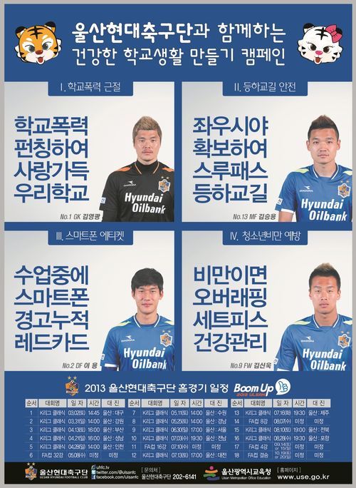 이번에는 학교폭력 근절, 등하교길 안전, 휴대폰 사용 예절, 건강관리에 대한 내용의 포스터를 제작해 울산지역 236개의 초, 중, 고등학교에 보급한다. 포스터는 축구 용어를 함께 표기해 학생들이 거부감을 느끼지 않도록 기획되었다.