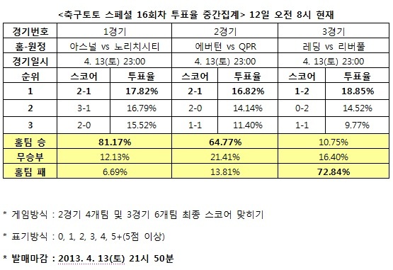 [축구토토] 국민체육진흥공단(www.kspo.or.kr)이 발행하는 체육진흥투표권 수탁사업자인 스포츠토토 공식 온라인 발매 사이트인 베트맨(www.betman.co.kr)은 오는 13일에 펼쳐지는 아스널-노리치시티(1경기), 에버턴-QPR(2경기), 레딩-리버풀(3경기)전 등 잉글랜드 프리미어리그 3경기를 대상으로 한 축구토토 스페셜 16회차 투표율 중간집계 결과, 축구팬 64.77%는 2경기 에버턴-QPR전에서 QPR이 패할 것으로 전망했다고 밝혔다.