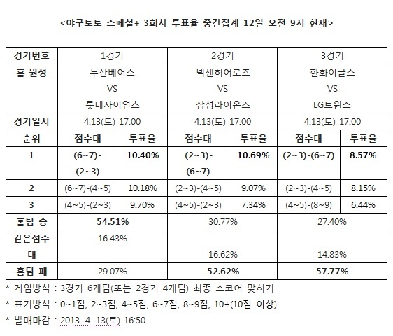 한편 이번 야구토토 스페셜+ 3회차 게임은 13일 오후 4시 50분에 발매가 마감된다.
