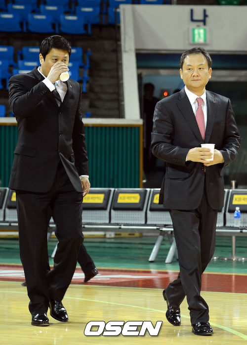 12일 오전 서울 잠실학생체육관에서 열린 '2012-2013 KBL 챔피언결정전 미디어데이'에서 문경은 감독과 유재학 감독이 입장하고 있다.