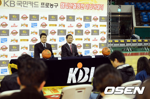 12일 오전 서울 잠실학생체육관에서 열린 '2012-2013 KBL 챔피언결정전 미디어데이'에서 문경은 유재학 감독이 질의응답 시간을 갖고 있다.