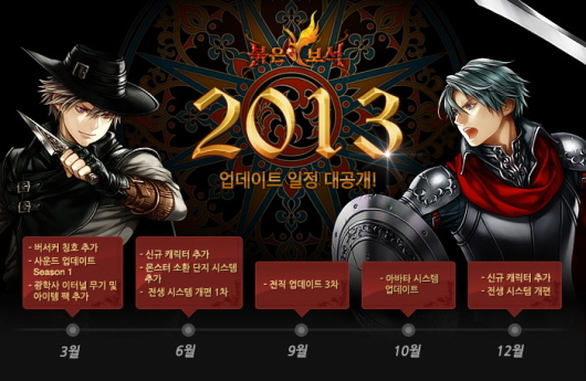 엘엔케이로직코리아 '붉은보석'은 올해 서비스 10주년을 기념해 2013년 업데이트를 실시했다. 지난 달 첫 업데이트를 통해 캐릭터 능력치가 상승하는 버서커 칭호를 업데이트했으며, 오는 6월에는 신규 캐릭터를 선보인다. 하반기에도 3차 전직을 추가하고 아바타 시스템 등을 업데이트한다.