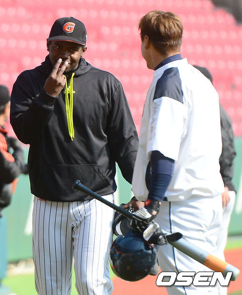 12일 오후 서울 잠실야구장에서 열리는 '2013 한국야쿠르트 세븐 프로야구' 두산 베어스와 롯데 자이언츠의 경기를 앞두고 두산 홍성흔과 롯데 유먼이 인사르 나누고 있다.