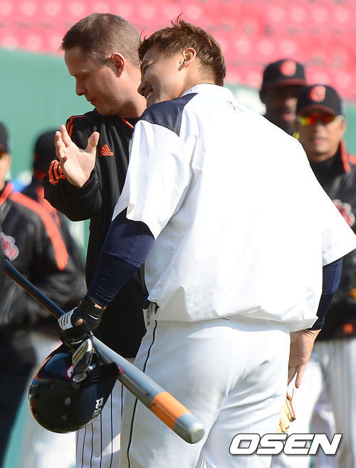 12일 오후 서울 잠실야구장에서 열리는 '2013 한국야쿠르트 세븐 프로야구' 두산 베어스와 롯데 자이언츠의 경기를 앞두고 두산 홍성흔과 롯데 옥스프링이 인사를 나누고 있다.