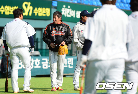 12일 오후 서울 잠실야구장에서 열리는 '2013 한국야쿠르트 세븐 프로야구' 두산 베어스와 롯데 자이언츠의 경기를 앞두고 롯데 김승회가 김동주를 비롯한 두산 선수들과 인사를 나누고 있다.