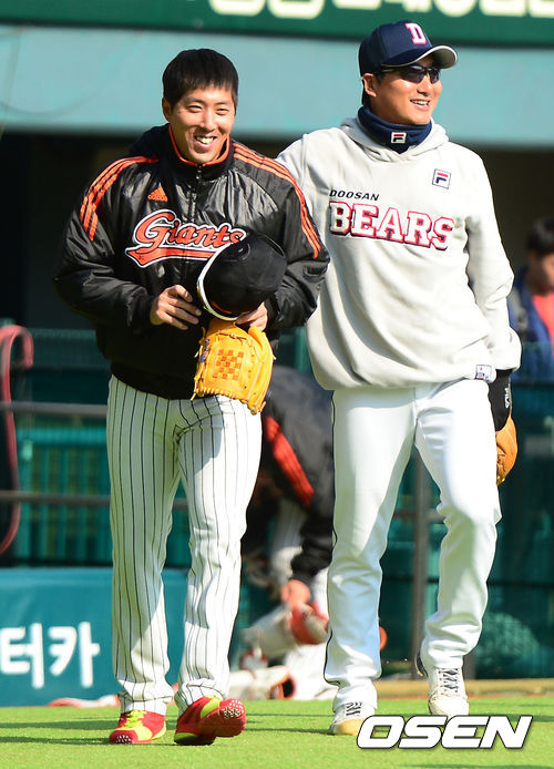 12일 오후 서울 잠실야구장에서 열리는 '2013 한국야쿠르트 세븐 프로야구' 두산 베어스와 롯데 자이언츠의 경기를 앞두고 롯데 김승회와 두산 정재훈이 인사를 나누고 있다.