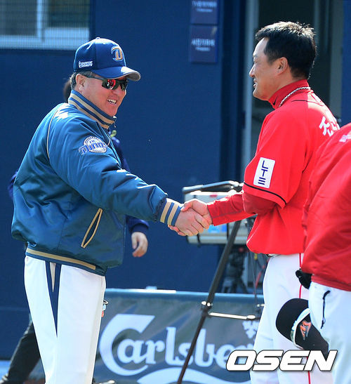 경기에 앞서 NC 김경문 감독과 SK 조인성이 인사를 나누고 있다.