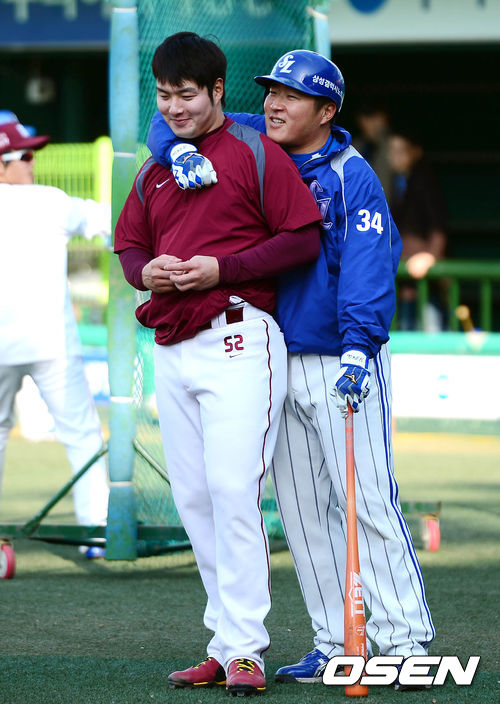 12일 오후 서울 목동구장에서 열리는 '2013 한국야쿠르트 세븐 프로야구' 넥센 히어로즈와 삼성 라이온즈의 경기 시작전 박병호와 최형우가 인사를 나누고 있다.