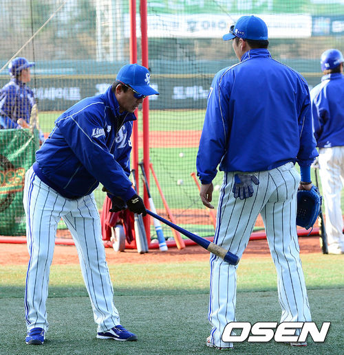 12일 오후 서울 목동구장에서 열리는 '2013 한국야쿠르트 세븐 프로야구' 넥센 히어로즈와 삼성 라이온즈의 경기 시작 전 김태한 투수코치가 권혁의 훈련을 돕고 있다.