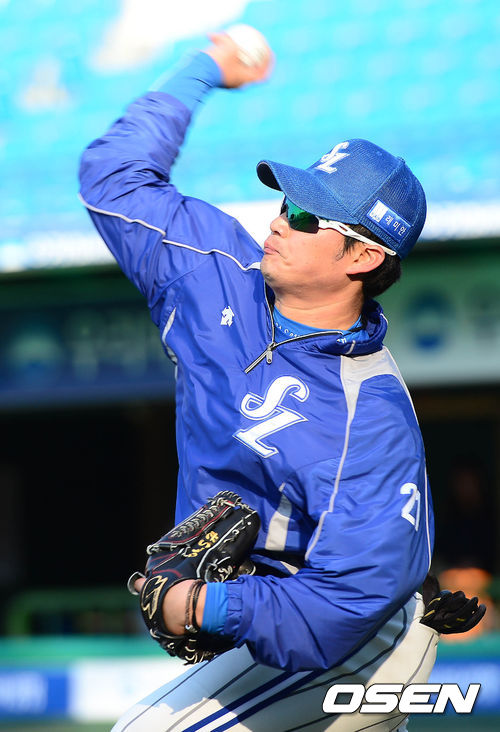 12일 오후 서울 목동구장에서 열리는 '2013 한국야쿠르트 세븐 프로야구' 넥센 히어로즈와 삼성 라이온즈의 경기 시작 전 오승환이 훈련을 하고 있다.