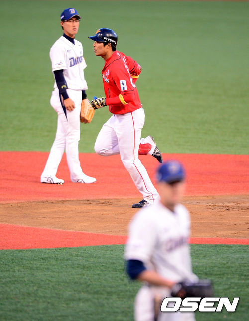 1회초 2사 3루에서 SK 한동민이 선제 투런포를 날리고 그라운드를 돌고 있다.
