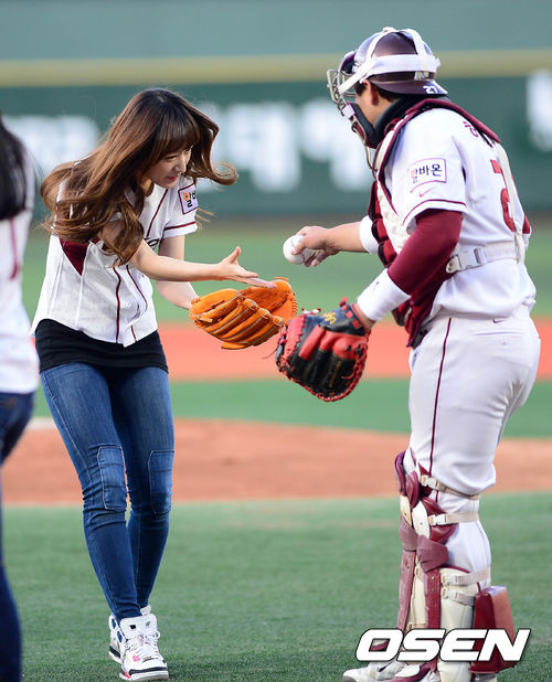 12일 오후 서울 목동구장에서 열린 '2013 한국야쿠르트 세븐 프로야구' 넥센 히어로즈와 삼성 라이온즈의 경기 시작 전 다소니 하니가 시구를 마친 후 시구공을 허도환으로부터 받고 있다.