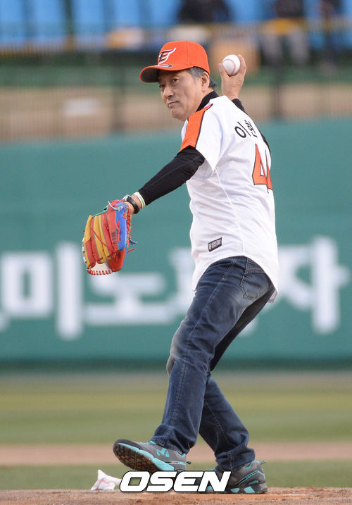 12일 오후 대전구장에서 열린 '2013 한국야쿠르트 세븐 프로야구' 한화이글스와 LG트인스 경기에 앞서 이현세 작가가 승리기원 시구를 하고 있다.