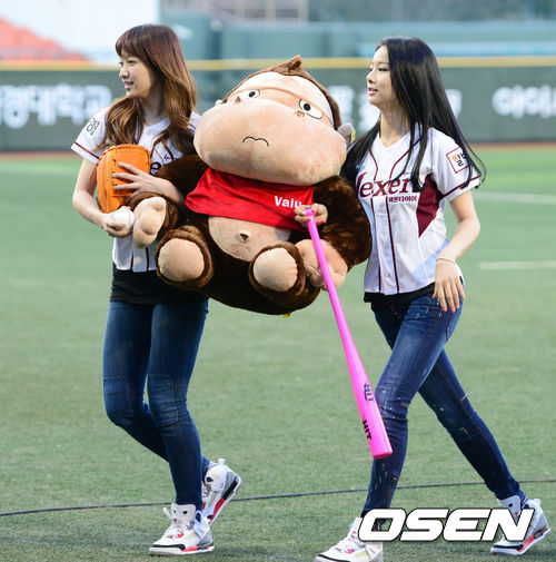12일 오후 서울 목동구장에서 열린 '2013 한국야쿠르트 세븐 프로야구' 넥센 히어로즈와 삼성 라이온즈의 경기 시작 전 다소니가 시구를 마치고 턱돌이에게 선물 받은 인형을 들고 그라운드를 걸어나가고 있다.