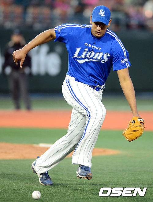 12일 오후 서울 목동구장에서 열린 '2013 한국야쿠르트 세븐 프로야구' 넥센 히어로즈와 삼성 라이온즈의 경기 2회말 1사 이성열의 땅볼을 로드리게스가 따라가고 있다.